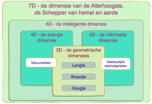 - Overliggende / Schepper-dimensie (7D) De ultieme, transcendente dimensie: de Bron van leven, orde en betekenis. Hier vinden we de autoriteit en richting die alle andere dimensies omvatten.
